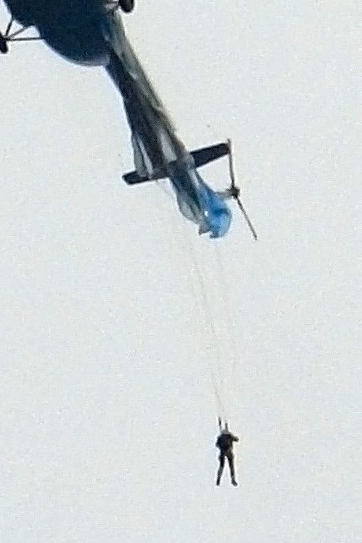 По словам мужчины, утром 16 марта увидел вертолет примерно на высоте двух километров в районе поселка Каштак. С помощью фотокамеры он рассмотрел, что вертолет тащит за собой парашютиста, который зацепился за хвост воздушного судна.