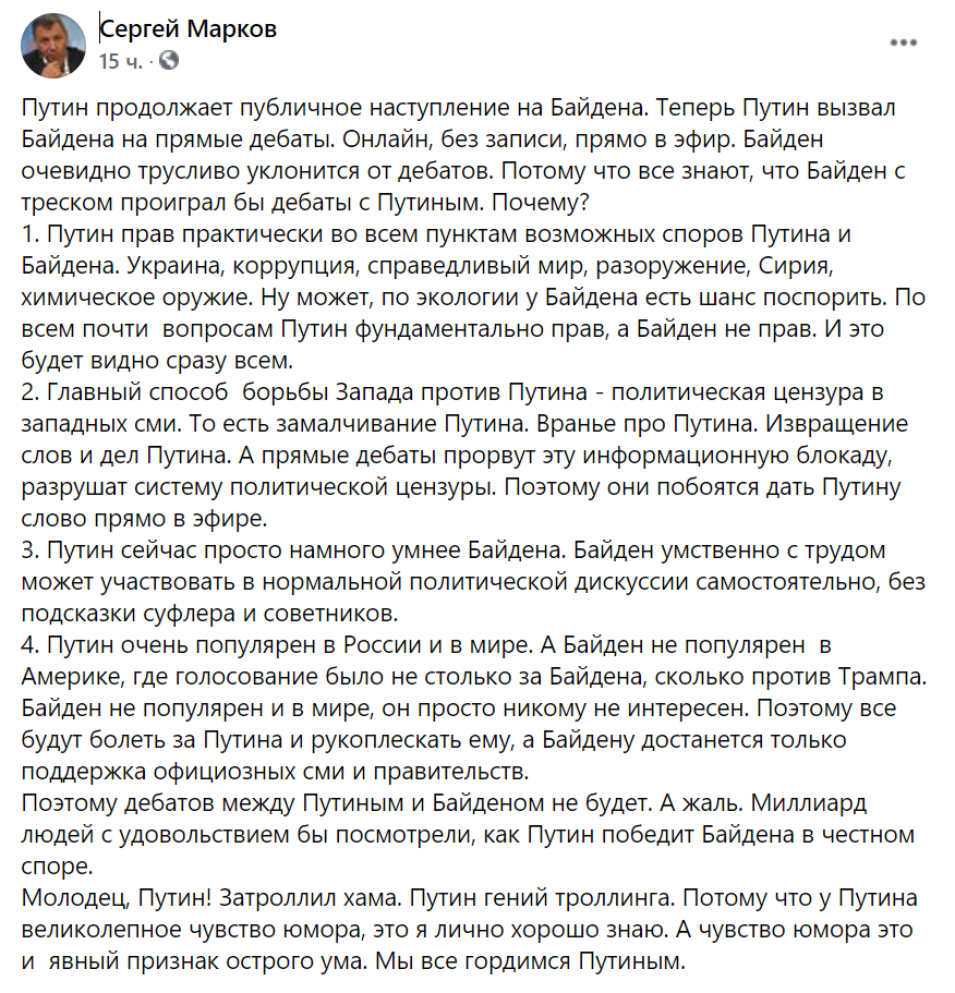 Именно поэтому Путин начал "истерить" про дебаты с Байденом, поскольку он жив до тех пор, пока обеспечивает "крышу" своим "отморозкам" и их деньгам.