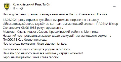 На Донбассе в бою под Горловкой 18 марта погиб младший сержант, командир боевой машины Виктор Пасека. 55-летний боец был родом из Хмельницкой области и служил в 109-м отдельном горно-штурмовом батальоне.