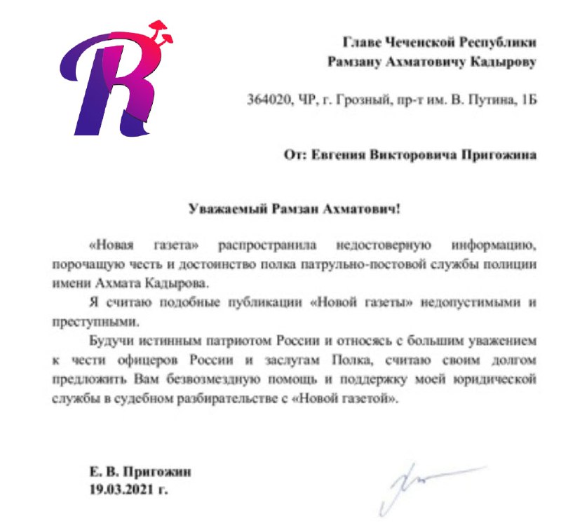 По мнению «повара Путина», публикации этого СМИ были «недопустимыми и преступными», напичканы «недостоверной информацией, порочащей честь и достоинство полка патрульно-постовой службы полиции имени Ахмата Кадырова». Он, Евгений Пригожин, представляющий себя «истинным патриотом России», считает своим долгом ̶п̶о̶д̶л̶и̶з̶н̶у̶т̶ь̶ помочь чеченскому лидеру. Кадыров жест оценил, назвал бизнесмена братом, а свой пламенный спич благодарности завершил лозунгом: РОССИЯ, ПУТИН, ВПЕРЕД!