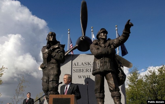 Памятник пилотам, перегонявшим американские самолеты из Аляски в Сибирь в рамках поставок по ленд-лизу. Фербэнкс, штат Аляска