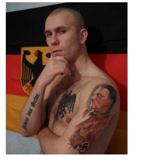 Как отметил журналист, член украинской делегации в ТКГ Денис Казанский, Раевский открыто называет себя сторонником идей Гитлера и даже набил на себе его портрет со свастикой.