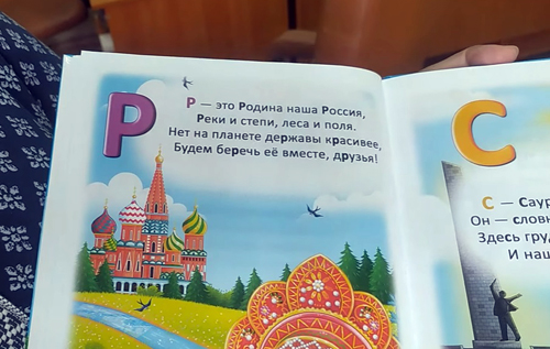 Книга наполнена пропагандой террористов и восхвалением России, которую составители "Азбуки" называют "Родиной". На одной из иллюстраций изображен мужчина в военной форме и с автоматом.