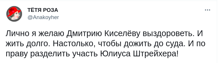 По информации Telegram-канала Mash, у российского пропагандиста диагностировали двустороннюю пневмонию со степенью поражения легких от 25 до 50%. Тяжесть состояния Киселева медики определяют как среднюю.
