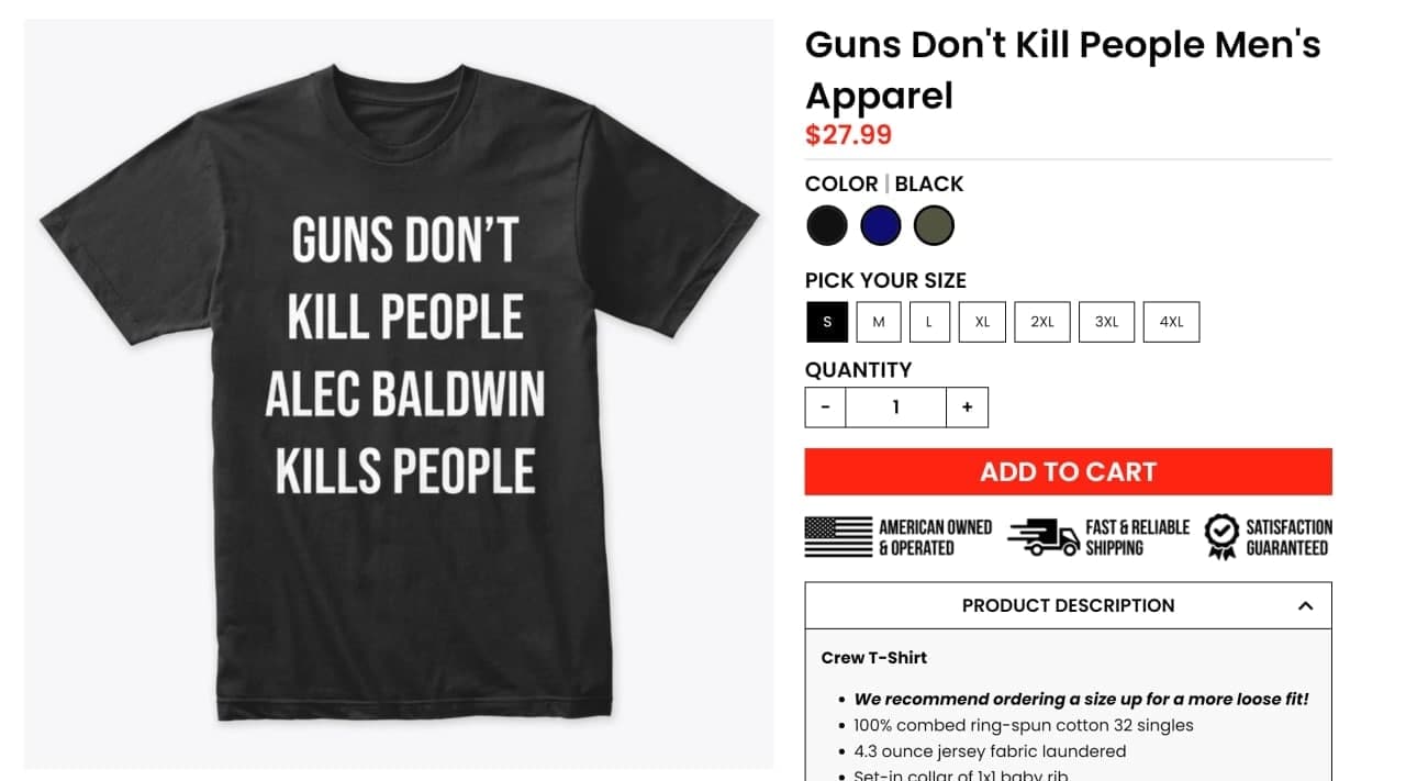 Футболку с надписью «Оружие не убивает людей. Алек Болдуин убивает людей» можно купить за 28 долларов.