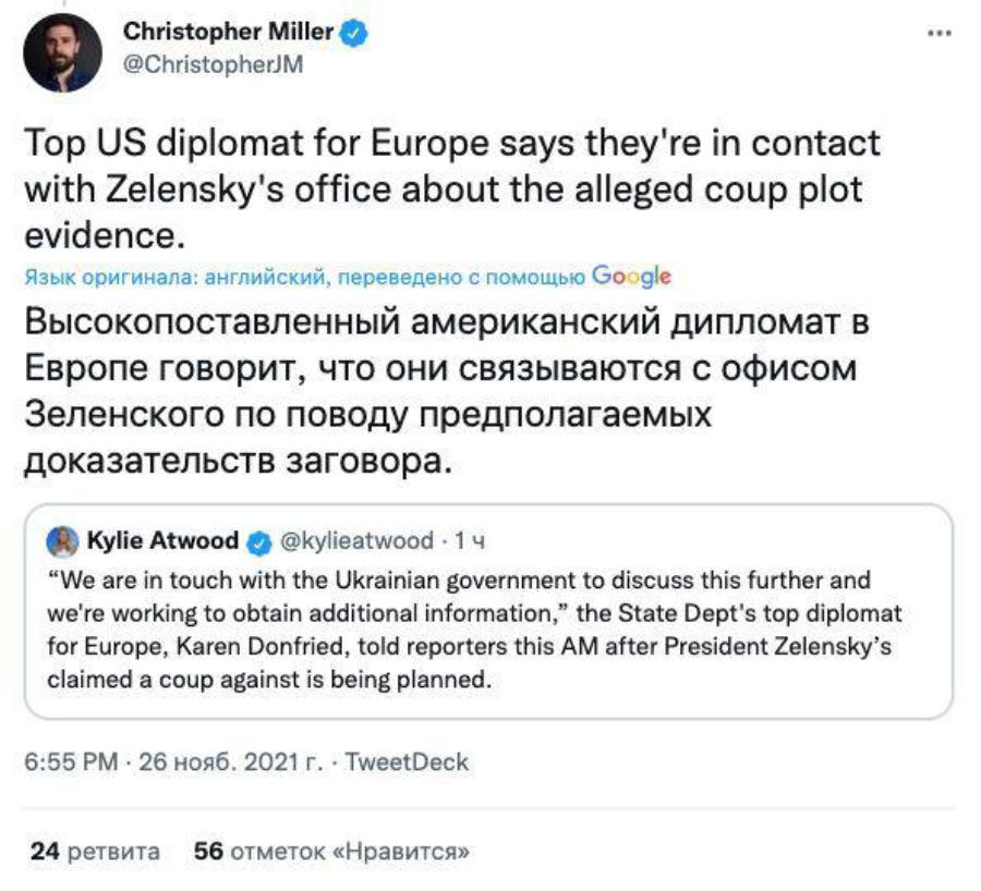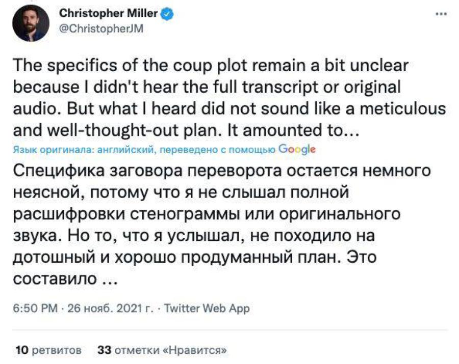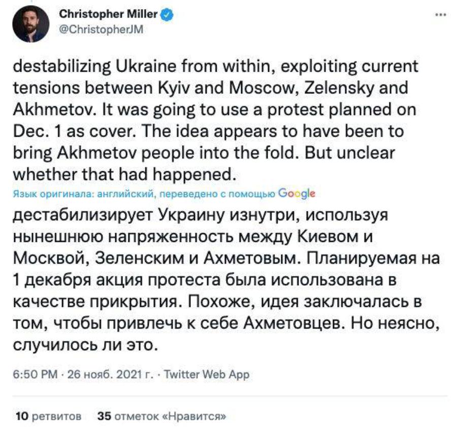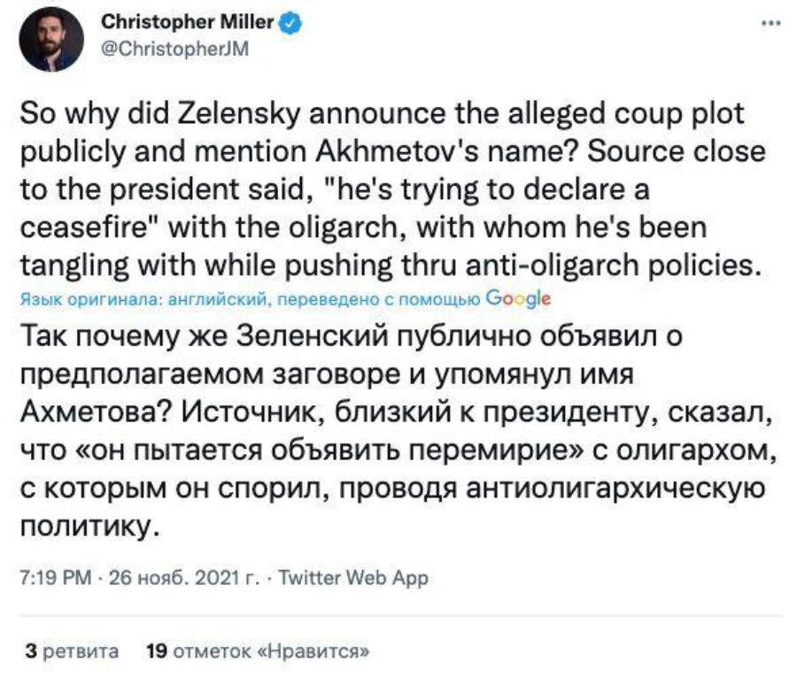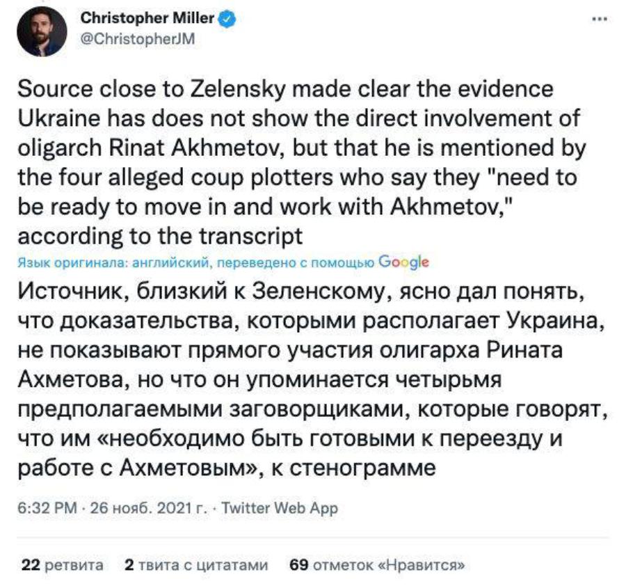 «Источник, близкий к Зеленскому, ясно дал понять, что доказательства, которыми располагает Украина, не показывают прямого участия Ахметова, но что он упоминается четырьмя предполагаемыми заговорщиками, которые говорят, что им «необходимо быть готовыми к переезду и работе с Ахметовым»…