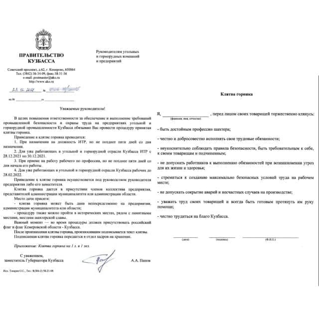 Согласно письму Панова, клятву горняка должны дать сотрудники предприятий угольной и горнорудной промышленности Кузбасса, участвующие в организации производственного процесса (ИТР), в срок с 28 по 30 декабря этого года, а также все рабочие этих предприятий — до 28 декабря.