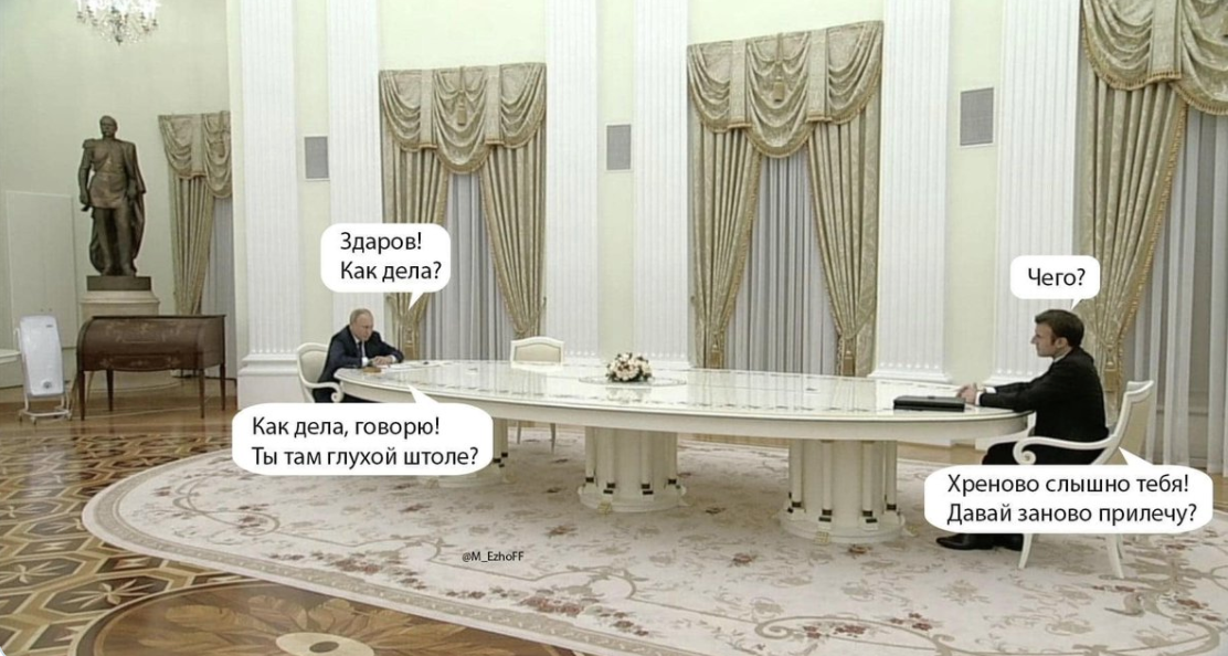Некоторым даже показалось, что такая длина стола недостаточна для культурной, национальной и экономической пропасти между президентами Франции и России, поэтому создали следующий вариант: