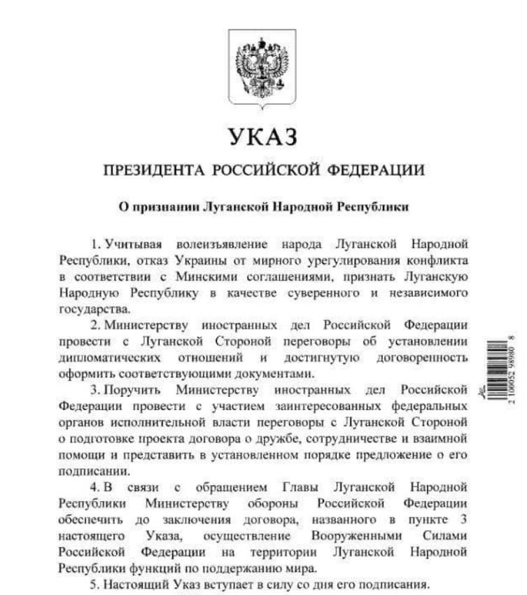 Путин поручил Министерству обороны РФ обеспечить поддержание мира в «ДНР» и «ЛНР» при помощи российских вооруженных сил. Об этом сказано в указе президента России.