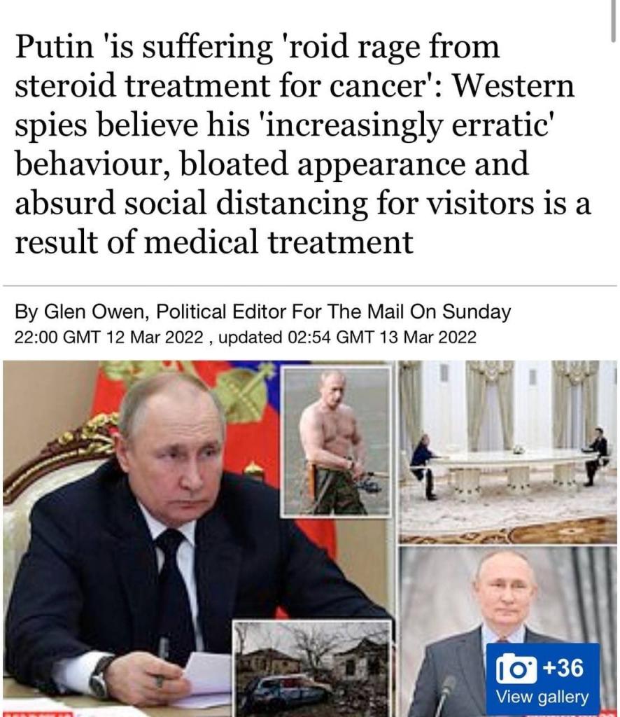 В материале говорится, что Путин "страдает от стероидов от рака". Западные шпионы считают, что его непредсказуемое поведение, внешний вид и абсурдное социальное дистанцирование от посетителей являются результатом лечения.