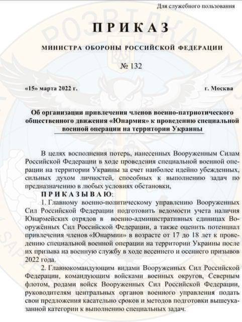 "Из-за нехватки живой силы для пополнения рядов оккупационной армии руководство Кремля рассматривает возможность привлечения к боевым действиям несовершеннолетних граждан РФ. Соответствующий приказ "Об организации привлечения членов военно-патриотического общественного движения "Юнармия" к проведению специальной операции на территории Украины" подписан министром Шойгу", - говорится в сообщении.