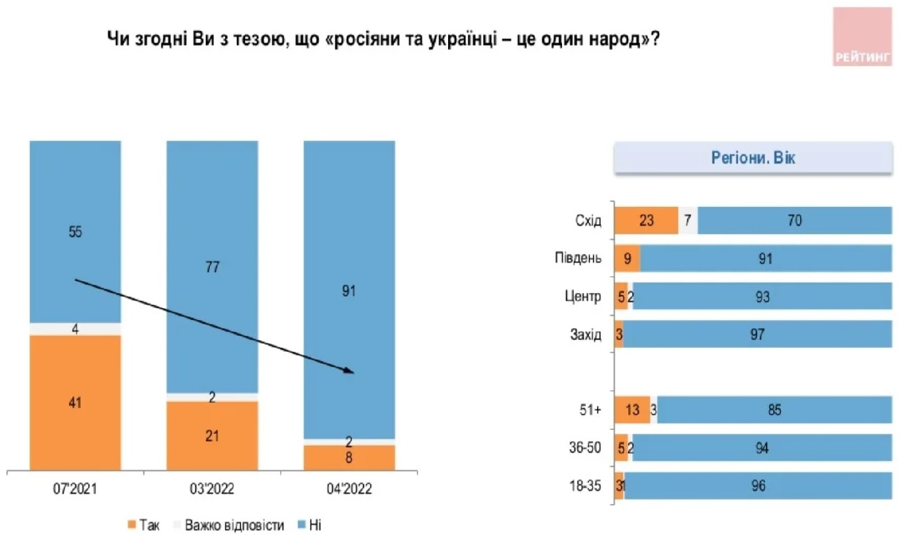 По сравнению с опросом, проведенным в июле 2021 года, число считающих себя "одним народом" с гражданами РФ, снизилось более чем в пять раз – с 41% до 8%.