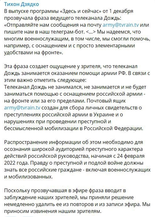 В эфире российского канала «Дождь», который позиционирует себя как оппозиционный и в настоящее время базируется в Латвии, прозвучала фраза о помощи мобилизованным на войну против Украины россиянам. В итоге гендиректору телеканала пришлось извиняться, а произнесший фразу журналист был уволен, передает «Агентство».
