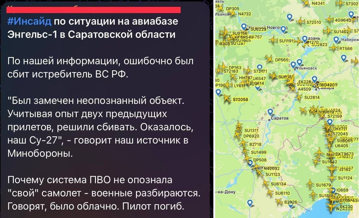 Силы ПВО РФ сбили самолет возле аэродрома "Энгельс" в четверг, 29 декабря. Однако он оказался российским Су-27. Об этом сообщает Управление стратегических коммуникаций ВСУ в своем Telegram-канале со ссылкой на информацию из российских СМИ.