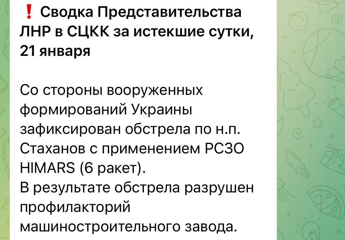 "Луганская область. Оккупированный Стаханов он же Кадиевка. Вчера был нанесен удар по бывшему профилакторию машиностроительного завода высокоточным оружием", - говорится в сообщении.