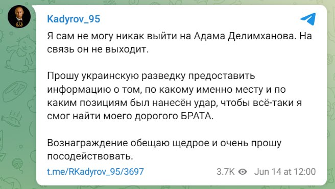 «Полностью снимаю все подразделения, дислоцированные в марьинском направлении, выезжаю в направлении места происшествия с Делимхановым… Поступила команда от Рамзана Ахматовича Кадырова найти его там любыми путями и вывезти, чего бы это ни стоило. Новая вводная для спецназа «Ахмат», выполним и этот приказ однозначно», — написал чеченский боевик.