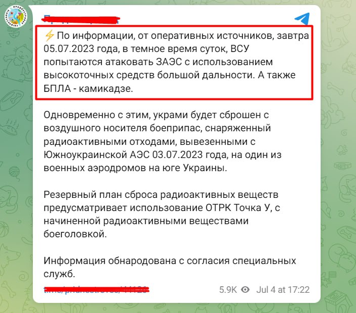 В Ру-каналах разгоняют новую методичку, будто ВСУ нанесут удар уже завтра. По данным украинской разведки, со станции уже эвакуируют персонал.