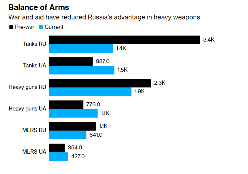 Отмечается, что если в начале войны Россия явно превосходила Украину в военной мощи, то к лету 2023 года по некоторым видам тяжелых вооружений преимущество РФ уже не такое очевидное, а по числу доступных современных танков Москва и вовсе уже может уступать Киеву.