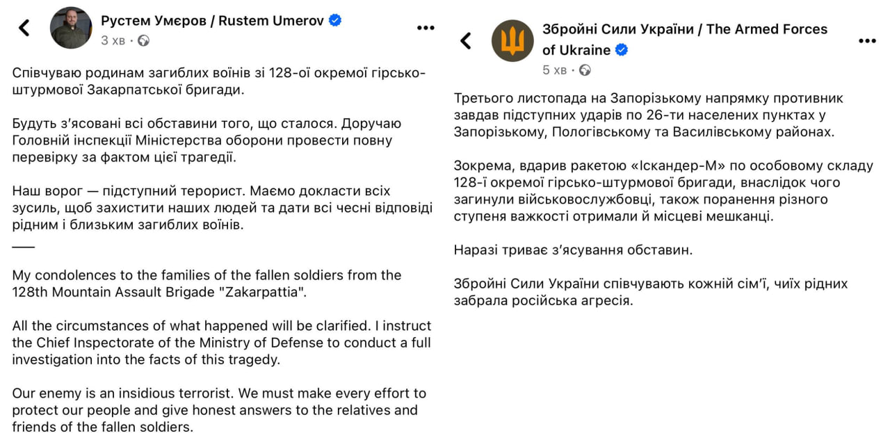 Министр обороны Украины Рустем Умеров официально подтвердил гибель военных из 128-й отдельной горно-штурмовой Закарпатской бригады на Запорожье в результате удара РФ и пообещал приказать всех виновных в этой трагедии.