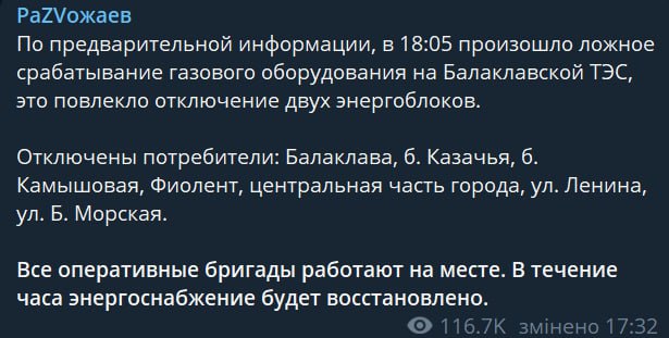 Назначенный оккупационными властями гауляйтер Севастополя заявил, что около 17:00 произошло "ложное срабатывание" газового оборудования на Балаклавской тепловой электростанции, из-за чего выключились два энергоблока.