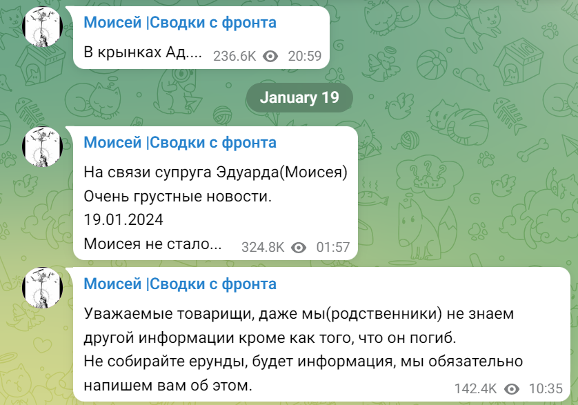18 января оккупант Моисей выходил на связь из Крынок. Он признался, что "в Крынках ад". Это сообщение отправлено 18 января около 21.00. А уже около 2.00 19 января в канале появился пост, в котором от имени жены оккупанта сообщается, что Моисей погиб.