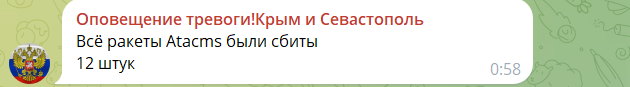 Один из анонимных пропагандистских каналов "Оповещение тревоги! Крым и Севастополь" заявил, что в Джанкое "сработала система ПВО", через 10 минут написал, что он ошибся и это "была работа наших" (то есть, оккупанты вели обстрел из Крыма), а в 00.57 утверждал, что на Крым якобы летело 12 ракет ATACMS, и "все сбиты".