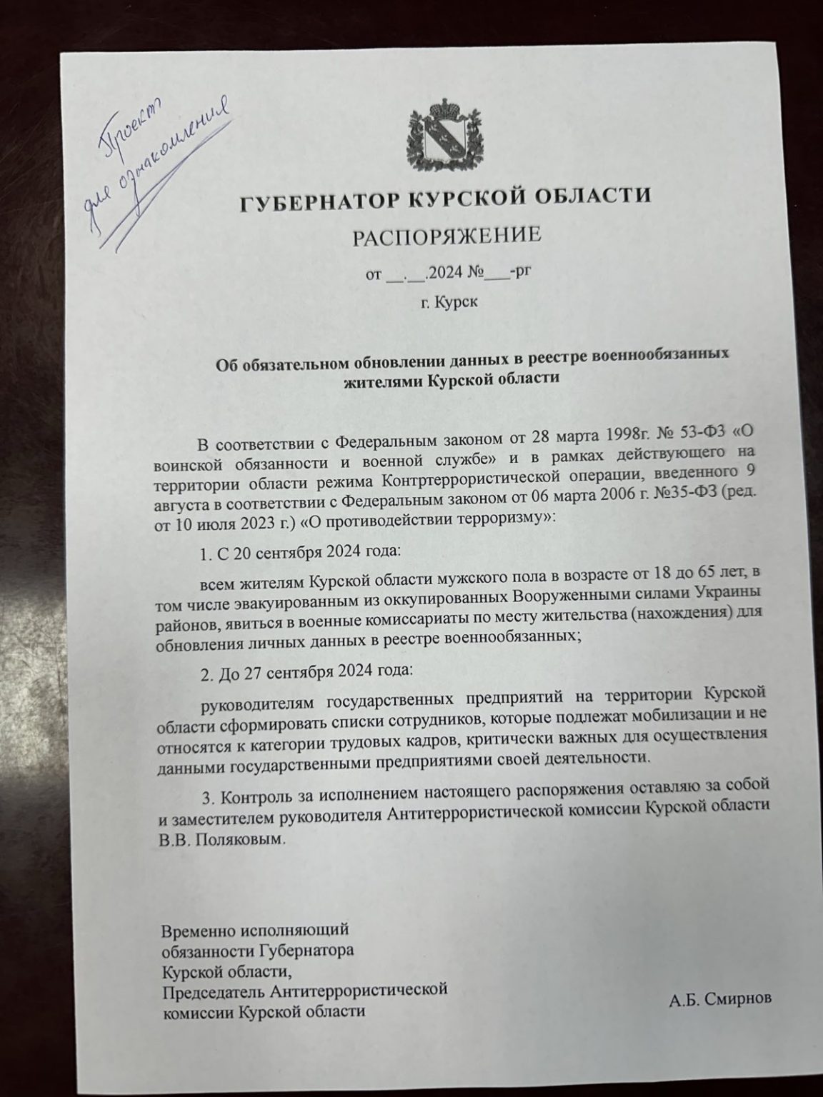 Согласно документу с пометкой «Проект для ознакомления», Смирнов намерен обязать всех мужчин области, в том числе перемещённых из оккупированных ВСУ районов, в возрасте от 18 до 65 лет обновить данные в реестре военнообязанных в военкоматах Курской области.