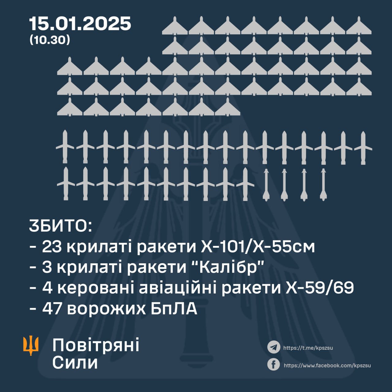 Силы ПВО сбили 77 целей: 30 вражеских ракет и 47 БпЛА, еще 27 дронов были локационно потеряны, да и не все не сбитые ракеты поразили цели.