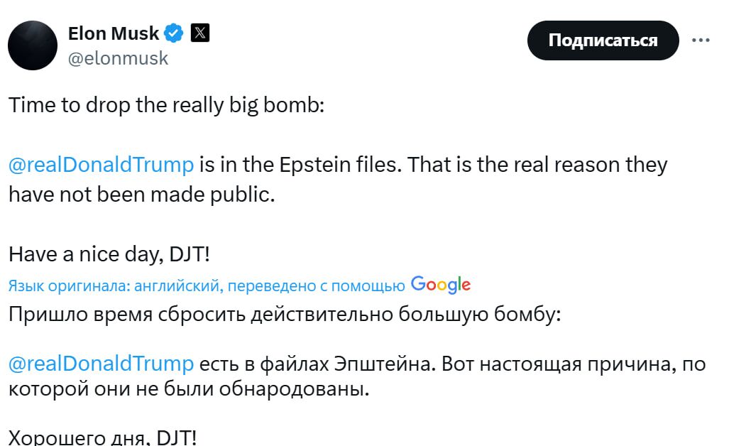 "Время сбросить действительно большую бомбу: Дональд Трамп есть в файлах Эпштейна. Вот настоящая причина, по которой они не были обнародованы", – написал Маск.