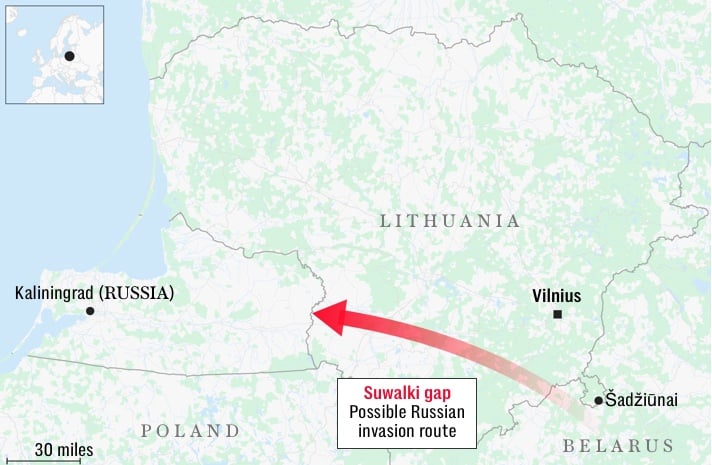 Особенно уязвимым является участок на выступе литовской территории, где граница с Беларусью охватывает три стороны, а расстояние до вражеской территории — всего несколько миль.