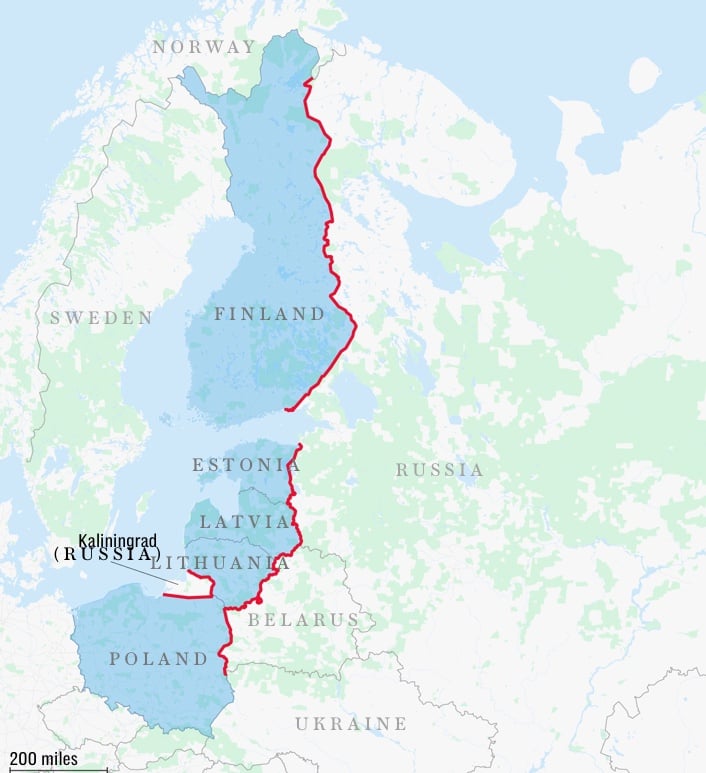 Среди стран, возвращающихся к этой практике, особенно сложная ситуация в Литве. Она имеет две протяженные враждебные границы — с Беларусью и Калининградской областью России. Между этими участками — ключевая стратегическая территория, известная как Сувалкский коридор, которая является единственным сухопутным путем для подкрепления балтийских стран в случае нападения.