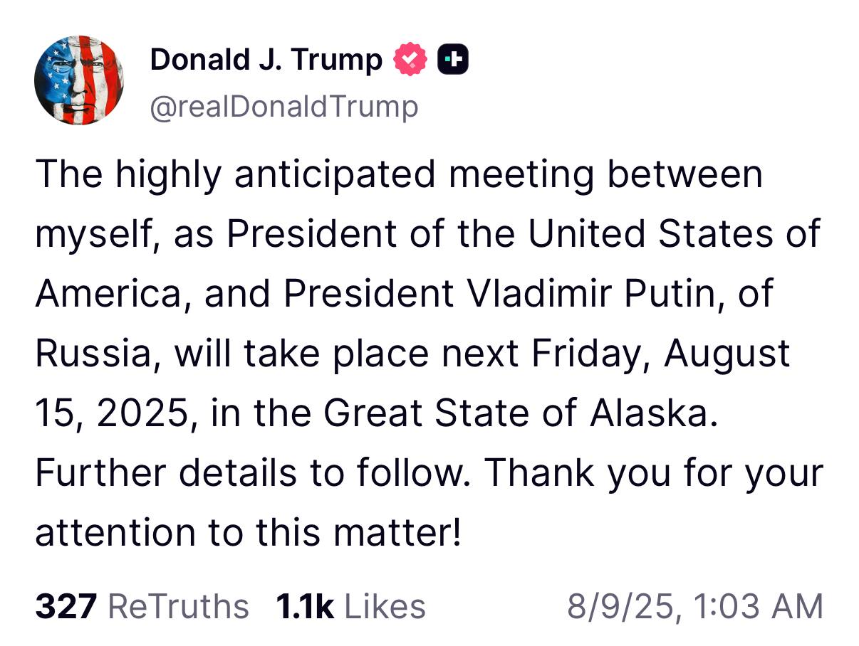 "Долгожданная встреча между мной, президентом Соединённых Штатов Америки, и президентом Российской Федерации Владимиром Путиным состоится в следующую пятницу, 15 августа 2025 года, в великом штате Аляска. Дополнительные подробности будут сообщены позже. Спасибо за внимание к этому вопросу", - написал Трамп соцсети Truth Social.