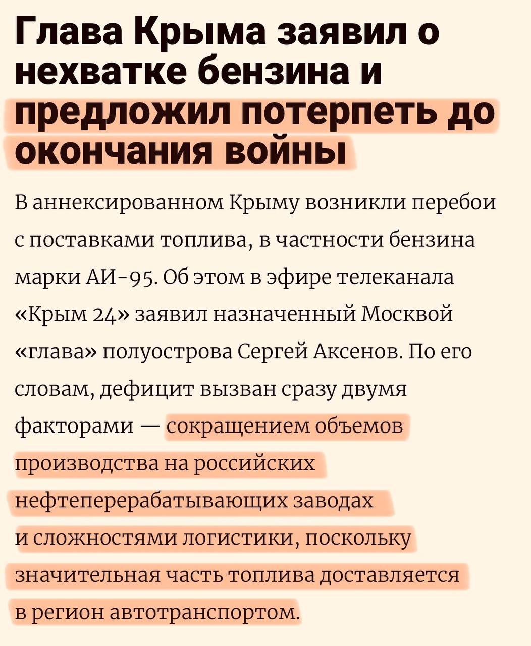 «Глава» Крыма Сергей Аксенов официально заявил, что на заправках в республике наблюдается дефицит бензина АИ-95 и других марок. Об этом сообщает ТГ-канал рф «Кремлевская табакерка», ссылаясь на источники в минэнергетики.