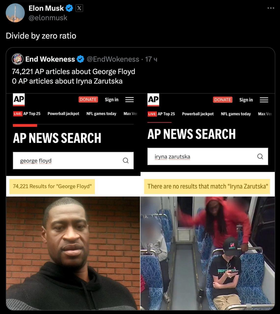 Американский миллиардер Илон Маск наехал на известное информационное агентство в США Associated Press, известное своими либеральными взглядами. Его возмутило то, что AP ни разу не вспомнила убийство украинки Ирины Заруцкой в США, которое совершил афроамериканец. В то же время, об убийстве другого афроамериканца полицейскими - 73 тысячи упоминаний на портале AP.