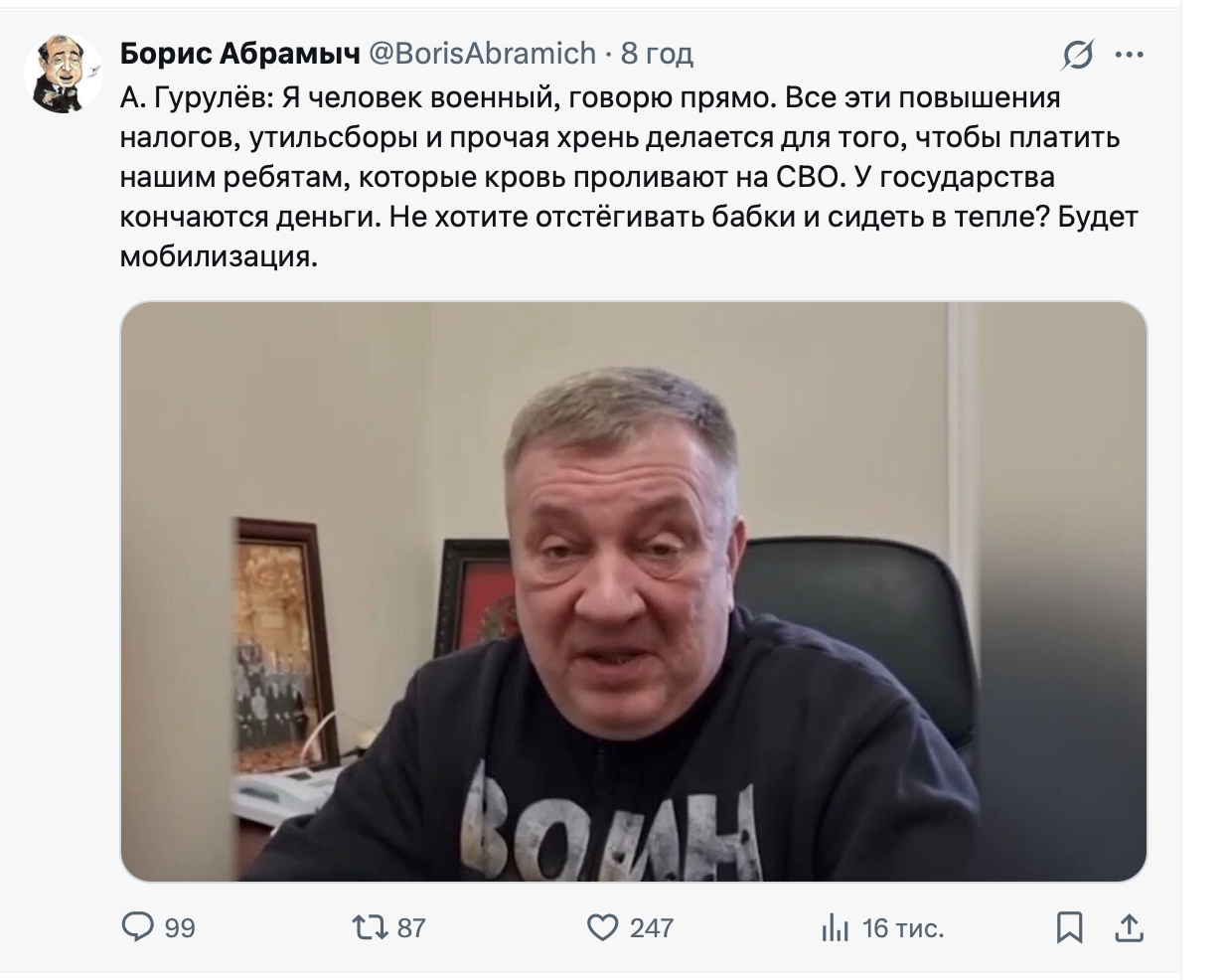 «Мы о кризисе предупреждали не раз. Будет сложно. С другой стороны, согласно результатам недавнего соцопроса, 70% россиян готовы экономить и ограничивать себя ради защиты страны. Потому кризис будет жестким, но наш народ встретит его если не с радостью (ведь СВО продолжится!), то с пониманием», – считает собеседник канала…».