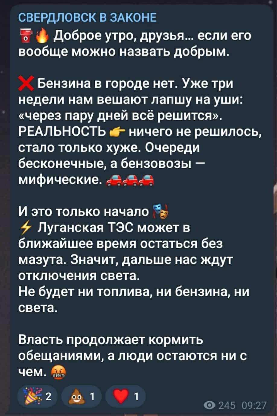 Донбас гине. На усю окуповану територію Луганщини та Донеччини більш менш життя зі світлом, водою, опаленням існує лише у кількох містах – Луганськ, Донецьк, Свердловськ (Довжанськ), Ровеньки, Красний Луч (Хрустальний), Краснодон (Сорокине), але Донбас гине.