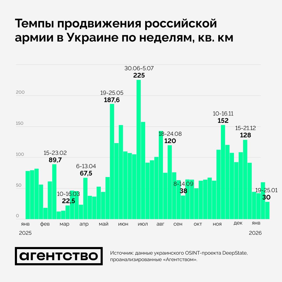 За последнюю неделю (с 19 по 25 января) российские военные захватили всего 30,4 кв км территории — это минимум с весны 2025 года, когда за неделю с 10 по 16 марта под контроль России перешли только 22,5 кв км. С 19 по 25 января Россия взяла под контроль 10,7 кв км в районе Константиновки, 6,4 кв км в районе Покровска и 7 кв км на южном участке фронта.