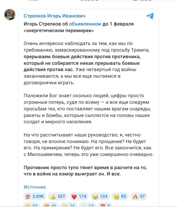 Стрелков раскритиковал "энергетическое перемирие", о котором якобы договорились РФ и Украина при участии США.