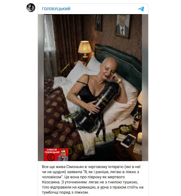 Все еще живая Симоньян в очередном интервью (которые у нее чуть ли не каждый день) заявила: "Я по-прежнему ложусь в постель с мужем".